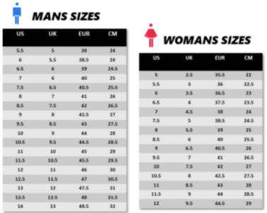 women US5.5=EU36=22.5cm, women US6.5=EU37=23.5cm, women US7=EU38=24cm, women US8=EU39=25cm, women US8.5=EU40=25.5cm, women US9.5=EU41=26cm, men US6.5=EU39=24.5cm, men US7=EU40=25cm, men US8=EU41=26cm, men US8.5=EU42=26.5cm, men US9.5=EU43=27.5cm, men US10=EU44=28cm, men US11=EU45=29cm, men US12=EU46=30cm